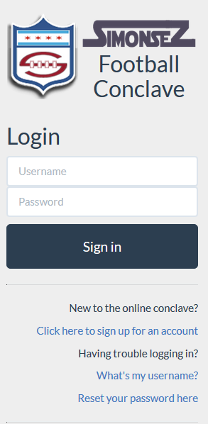 The main landing page for the SIMONSEZ Football Conclave changes based on the current NFL Season number