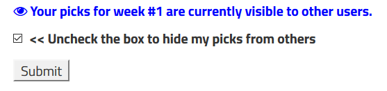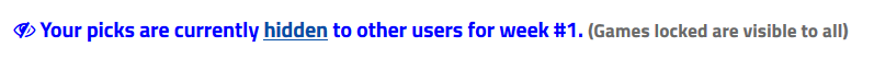 - If you chose to hide your picks, they will become visible once that particular game is locked (30 minutes before actual game time)