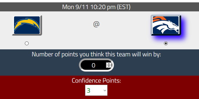 This is the only game where you have the option to choose a number of confidence points for the team you think will win. If you don't choose any points (keep it at 0), then you will not have any additional points added to your total points for that week.