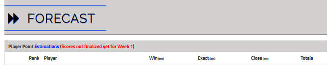 3.) Forecast: This view is hidden if the week has not started yet or if all of the scores have been entered for the week.